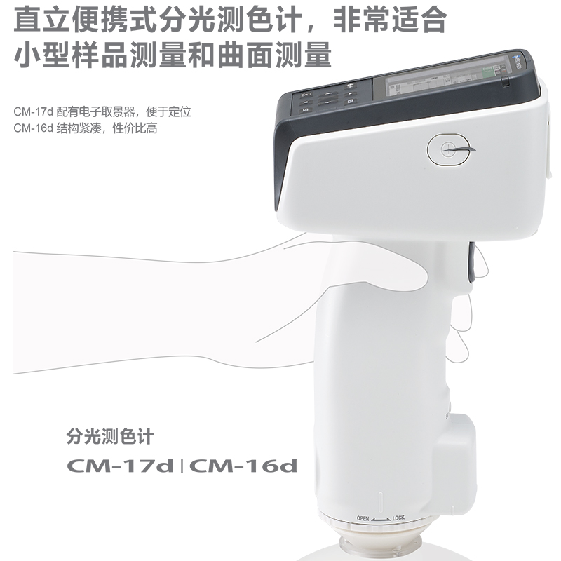 CM-17D 是柯尼卡美能达推出的高性能直立式便携分光测色仪,尤其适合小型样品、曲面及难以定位的物体进行精确色彩测量。它配备了 电子取景器,使用户能够轻松快速地定位测量点,保证测量的准确性与可重复性。同时,CM-17D 采用与 CM-700d 系列兼容的 di:8° / de:8°积分球,大幅提升测量精度,并在缩短测量时间方面表现出色。