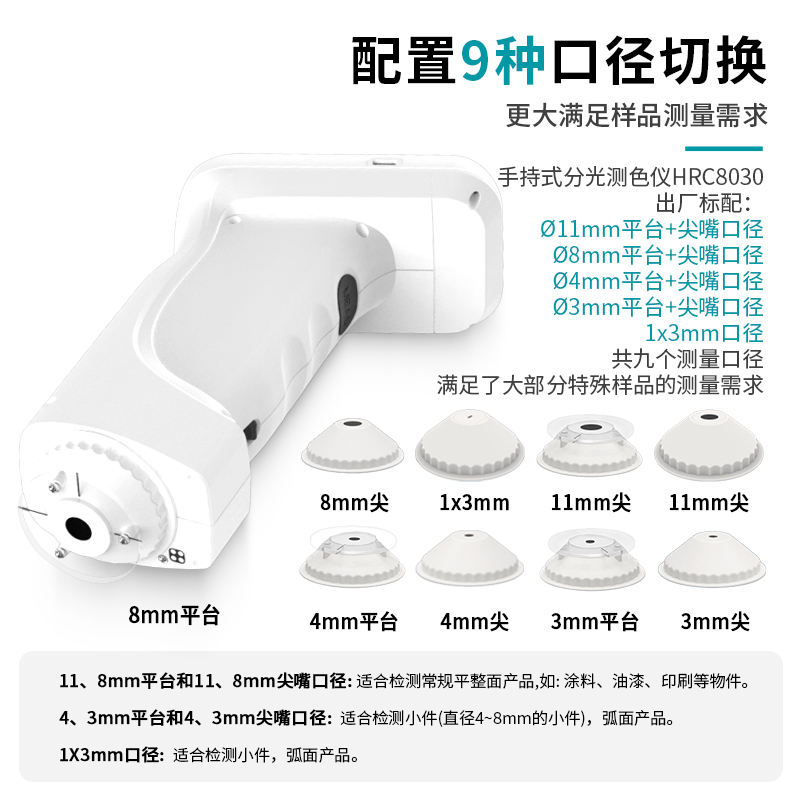HRC8030 配备九种测量口径组合: 11mm、8mm、4mm、3mm 平台及尖嘴口径, 以及 1×3mm 微小区域测量口径, 可灵活应对小面积、不规则或精细样品的颜色测量。